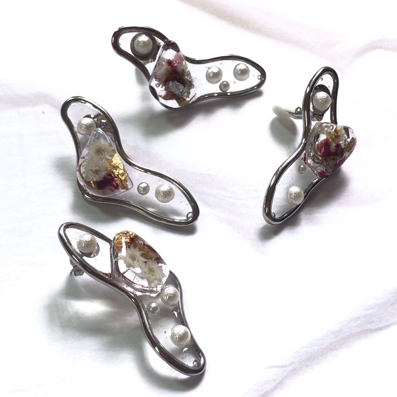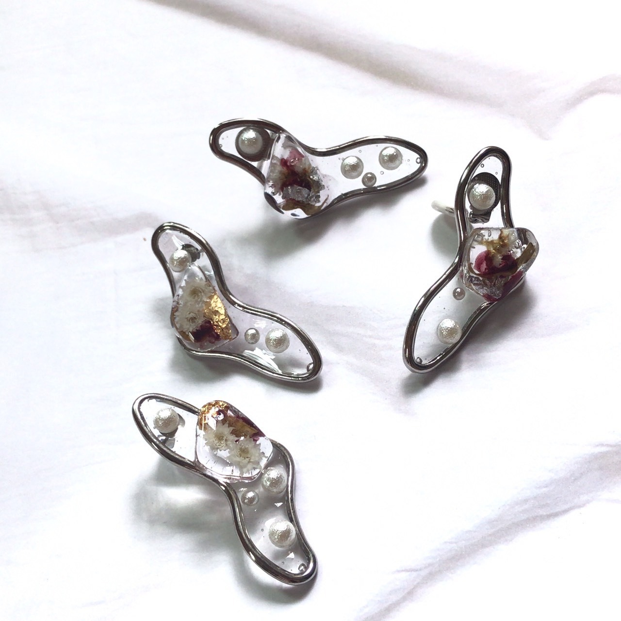 うねうねパーツに押し花、パール、金箔をのせて